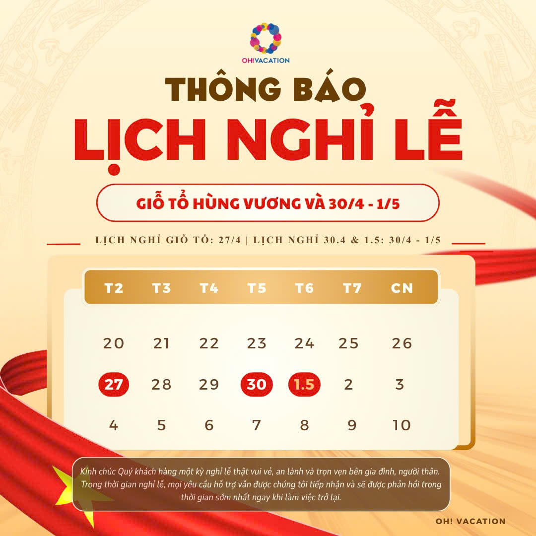 – Giỗ Tổ Hùng Vương: Nghỉ ngày 27/04