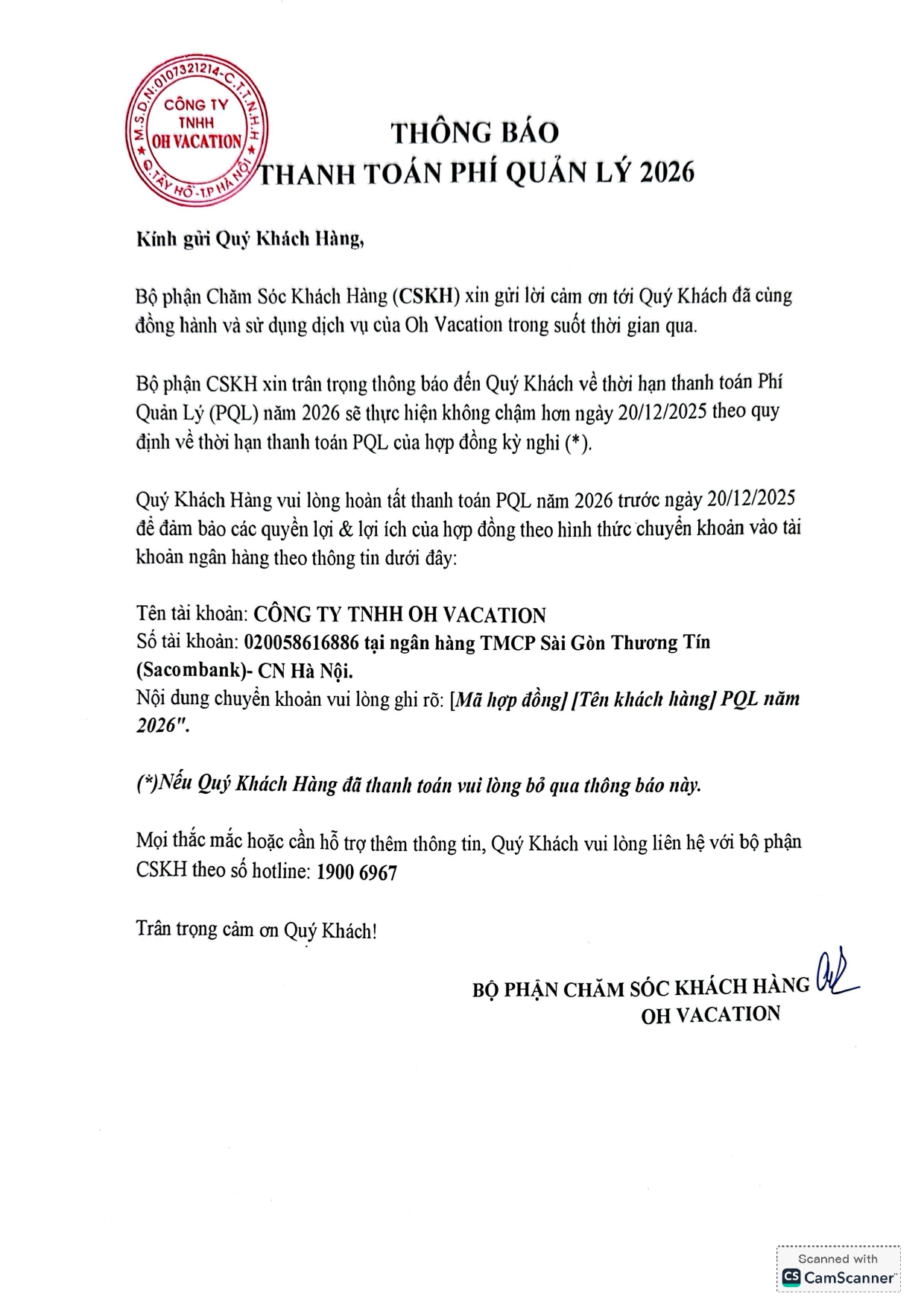 THÔNG BÁO THANH TOÁN PHÍ QUẢN LÝ 2026